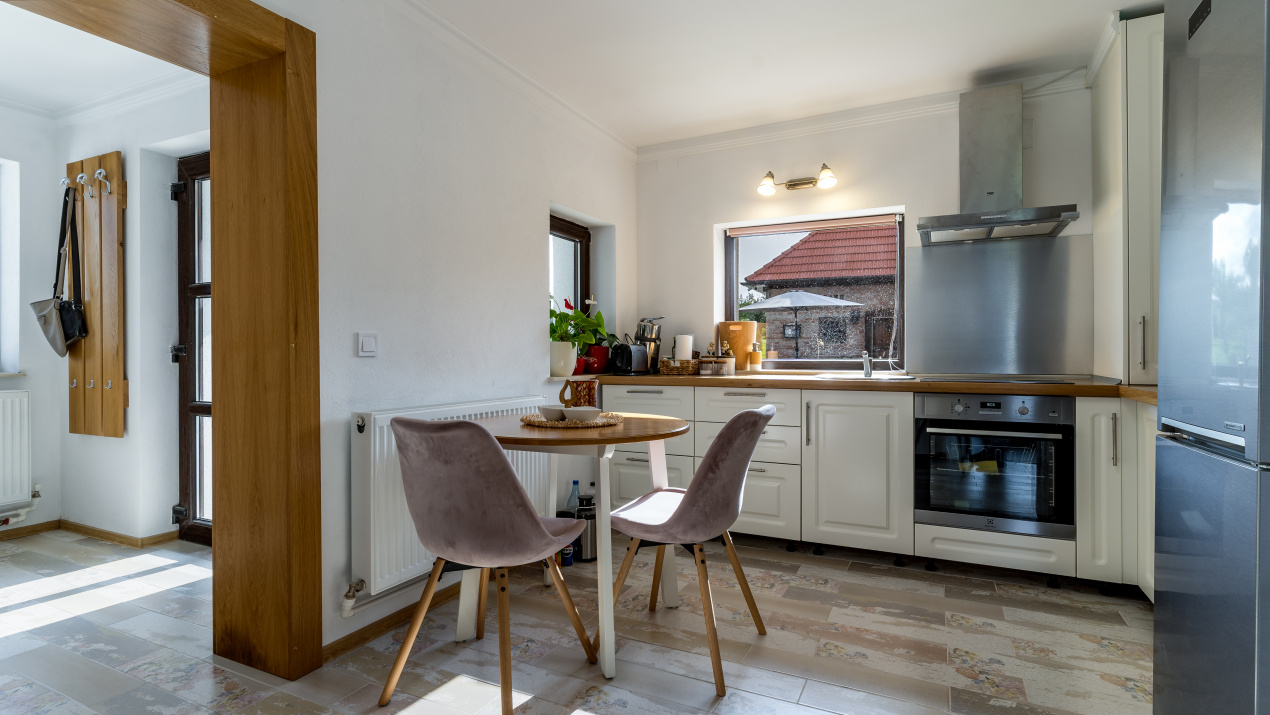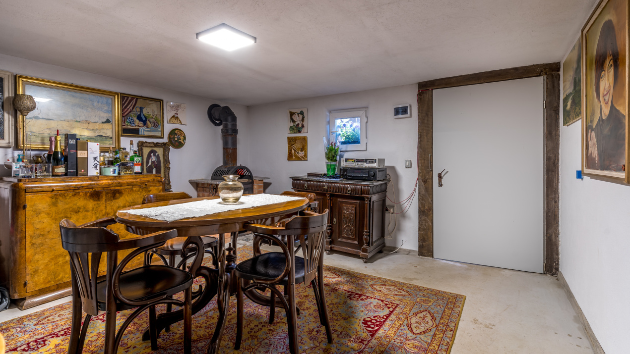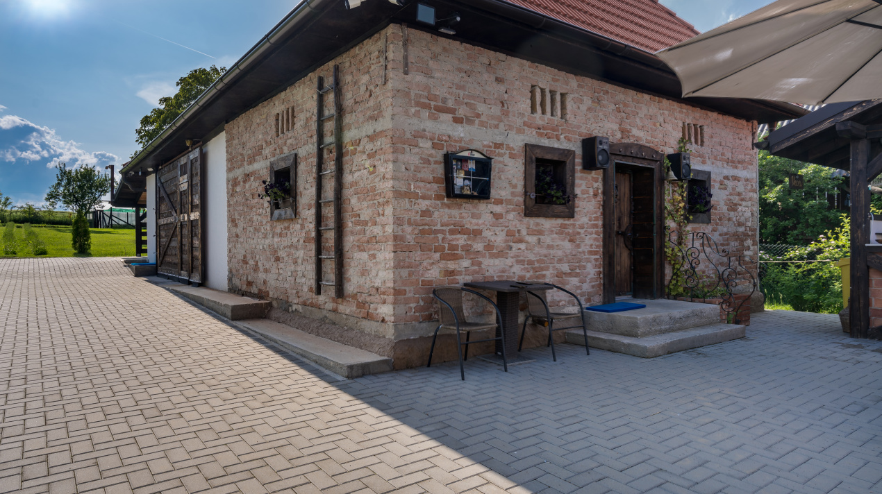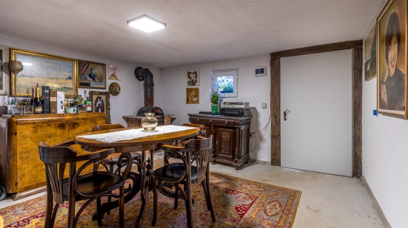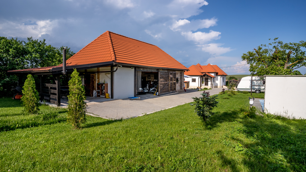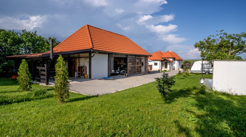 Anexă recondiționată (fosta șură): zonă de zi, cămară și spațiu de parcare pentru 3 mașini.